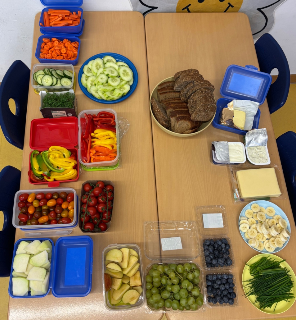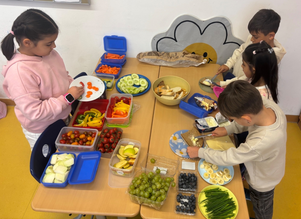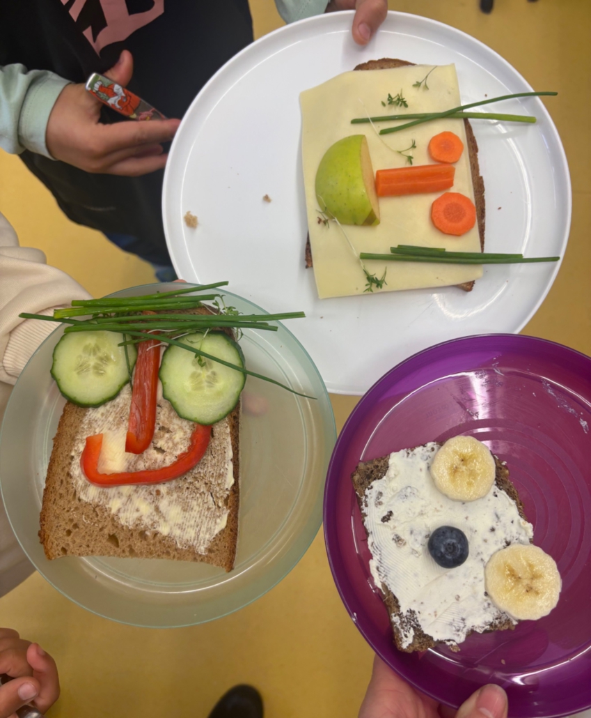 Gemeinsam bereiteten die Kinder ein buntes Buffet mit vielen leckeren und gesunden Lebensmitteln vor. Es gab frisches Obst, Vollkornbrot, Käse und natürlich jede Menge knackiges Gemüse. Besonders viel Spaß hatten die Kinder beim Gestalten ihrer eigenen lustigen Gemüsegesichter – mit Gurkenaugen, Karottennasen und Schnittlauchhaaren.